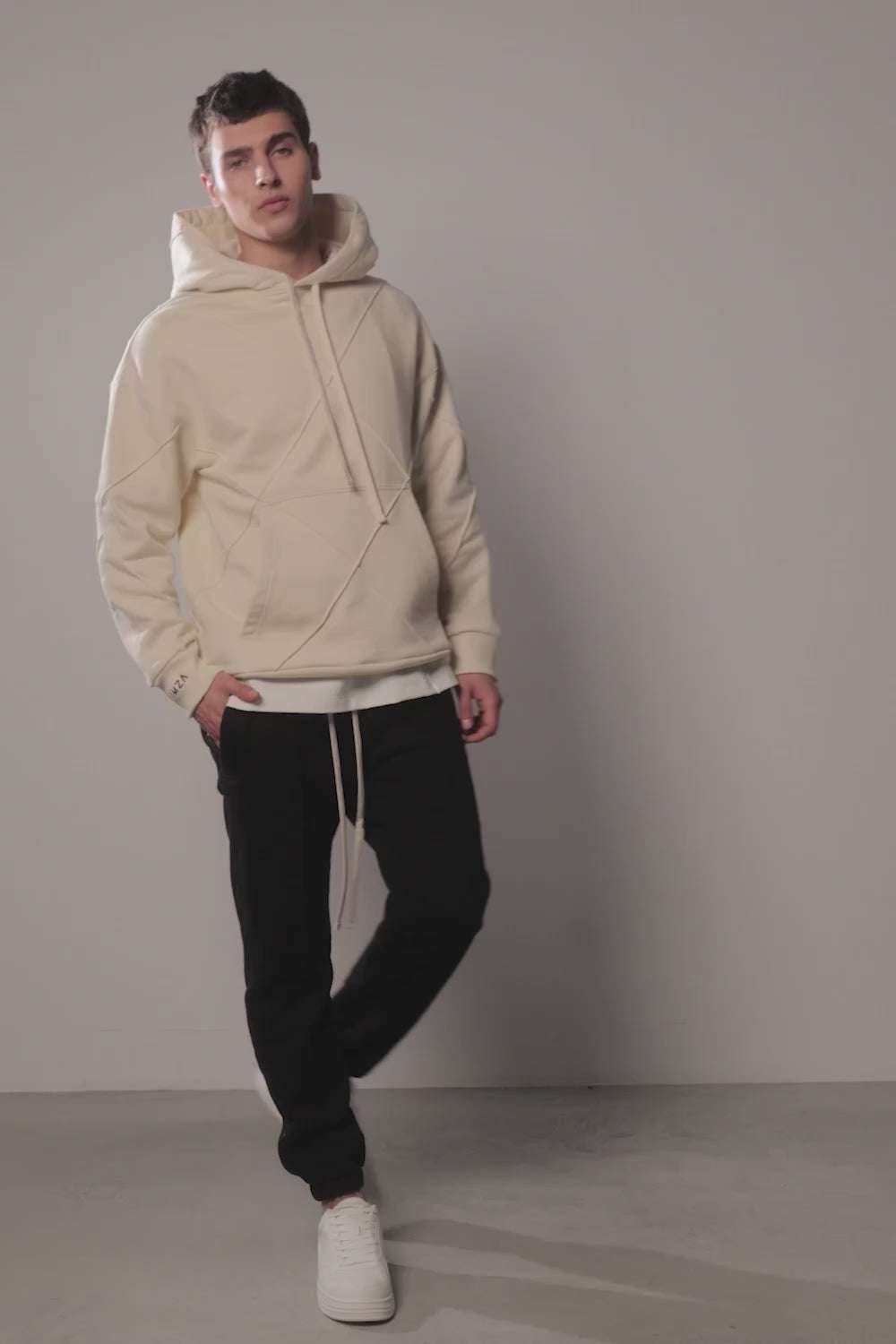 The silhouette features an elastic hem at the ankles for a clean, modern structure. Decorative stitching highlights the construction of the garment, while the elasticated waistband with an adjustable drawstring ensures a secure and customizable fit.