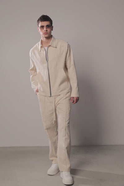 The straight leg silhouette creates a clean and balanced shape, while subtle distressed pin-details across the fabric add texture and a raw, artisanal character. An elasticated waistband with an adjustable drawstring ensures a flexible and comfortable fit, blending casual ease with refined design.