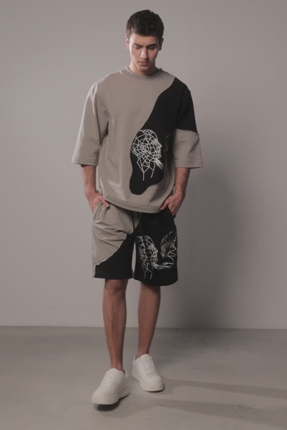 The asymmetric two-tone construction creates a dynamic visual balance, elevated by a geometric printed patch on the black panel for a distinctive edge. Designed with an elasticated waistband and adjustable drawstring, they ensure a secure and adaptable fit.