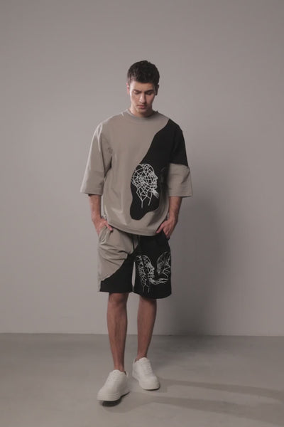 The asymmetric two-tone construction creates a fluid contrast between tones, enhanced by a geometric graphic print that adds depth and identity to the piece. The relaxed, oversized fit offers effortless comfort and a modern silhouette that elevates everyday wear.